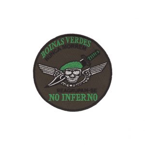 Emblema bordado sobre uma base de tecido verde, bordado a preto, medidas aproximado 60 * 50 mm
