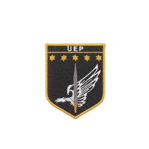 Emblema retangular, bordado sobre uma base de feltro azul, sendo bordado a branco, tamanho aproximado 35 * 25 mm