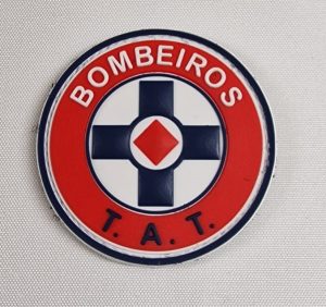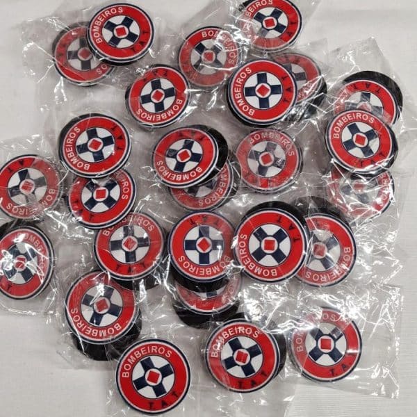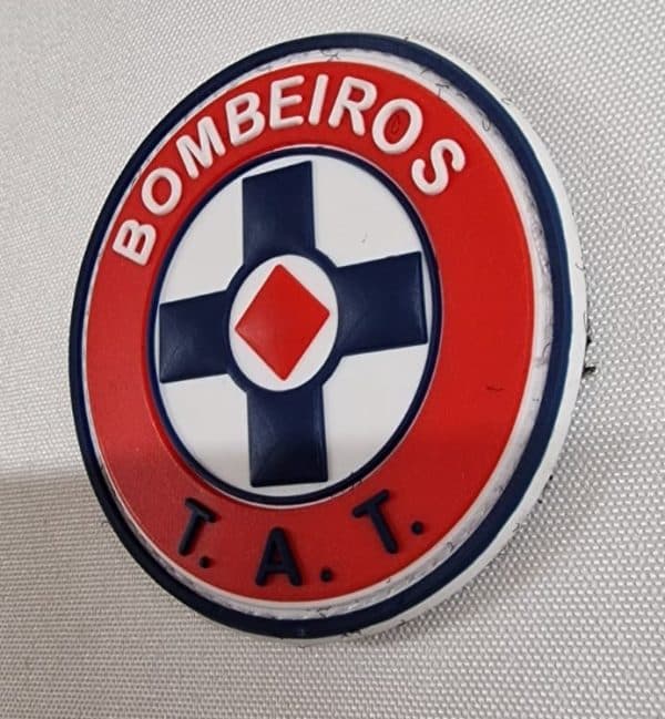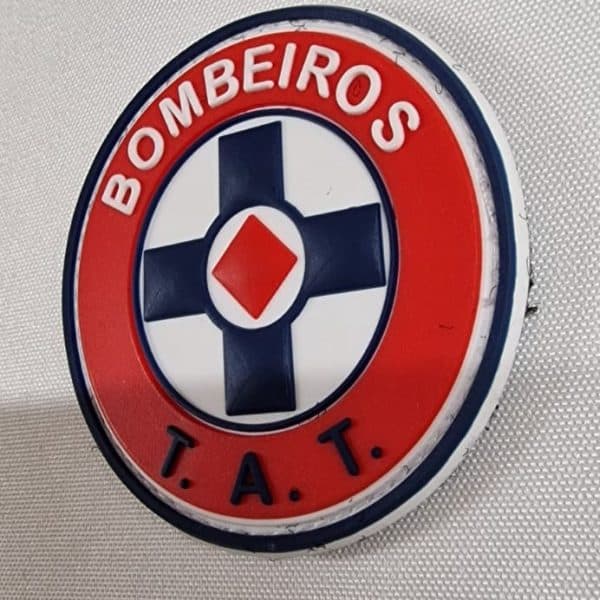 Emblema redondo vulcanizado sobre uma base vermelha, diâmetro aproximado 60 mm