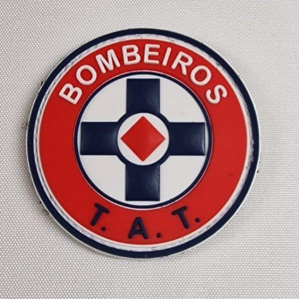 Emblema bordado sobre uma base de feltro branca, diâmetro aproximado 65 mm, com velcro